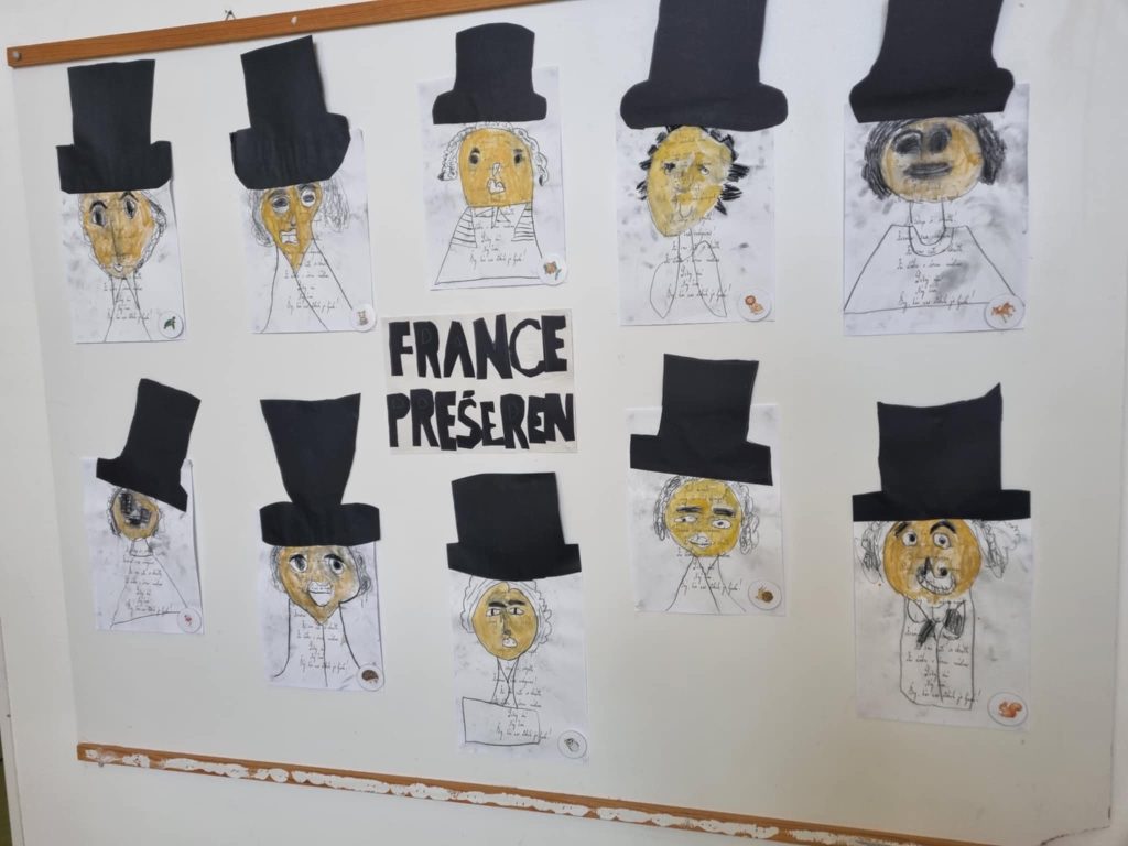 Vse skupine vrtca smo se zbrale v avli, kjer smo počastili Franceta Prešerna s kulturnim programom. Poslušali smo Slovensko himno. Spoznali pomen zastave in njenih barv. Skupaj prepevali in deklamirali.